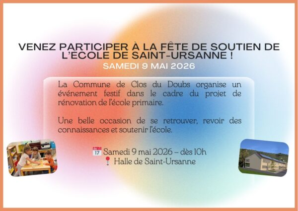 9 janvier 2026 Dans Manifestation Commentaires désactivés Fête de soutien de l’école de Saint-Ursanne le 9 mai 2026
